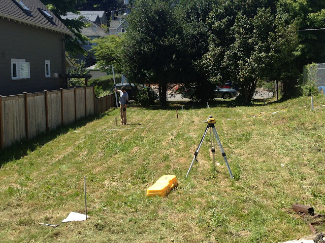 We have finally started construction.  Above is a photo of Neil and I figuring out what the first floor height would be and staking out the house.  The site is relatively flat, but there is a slight slope across the site that we had to take into account.  2' from front to back and 2' from side to side.  Below was the start of excavation and removal of 3 trees.  2 holly trees and a camellia tree.  We kept an Aralia elata out front which has a beautiful red color in the fall that goes well with the Karina house color.